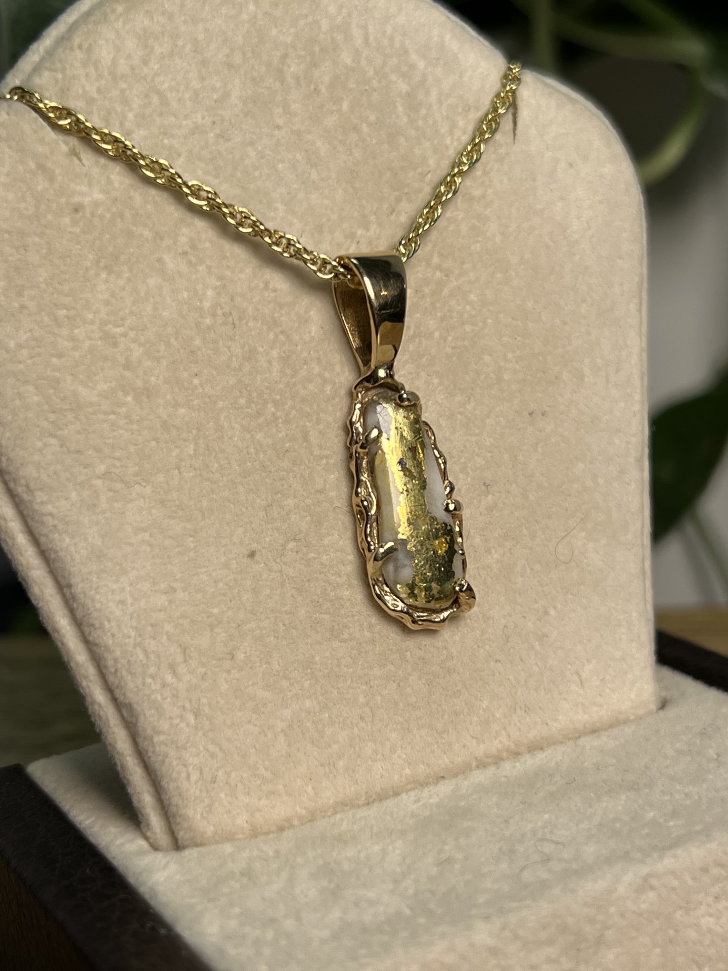 CUSTOM/HAND CRAFTED GOLD IN QUARTZ IN A 14KT SETTING. (chain is for display only)