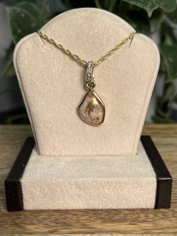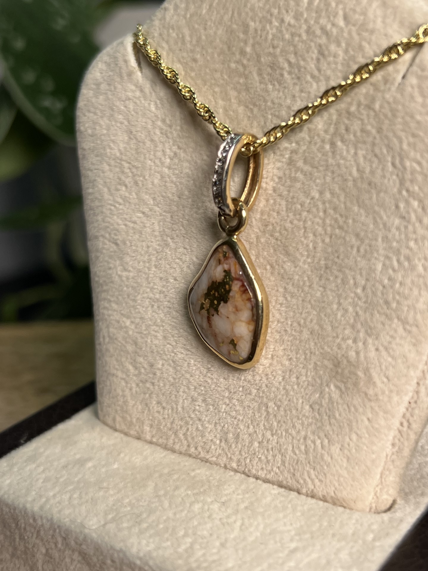 CUSTOM/HAND CRAFTED GOLD IN QUARTZ WITH WHOLE CUT DIAMONDS – PENDANT IN A 14KT SETTING.